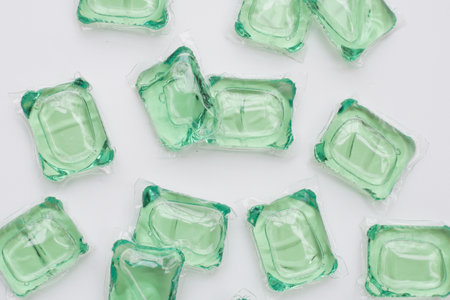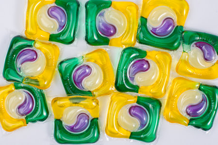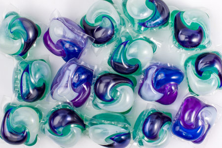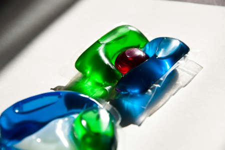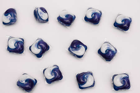 Dishwasher detergent capsules and or laundry soap close-up background.