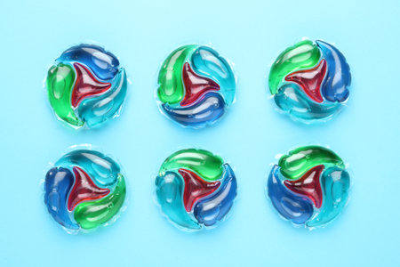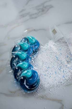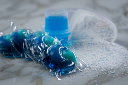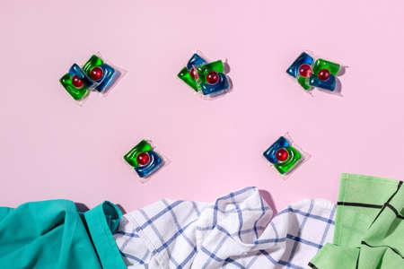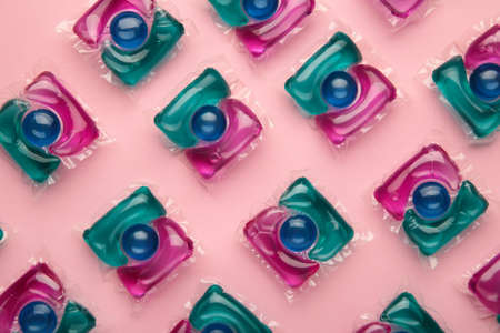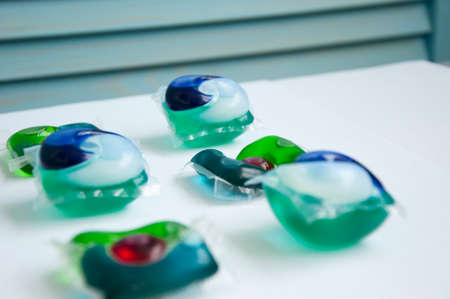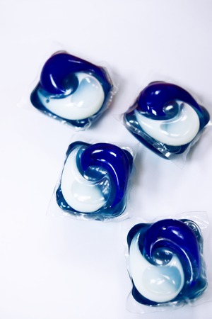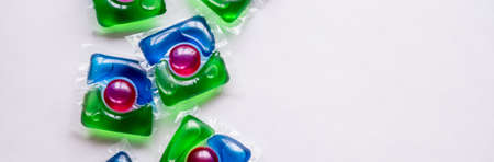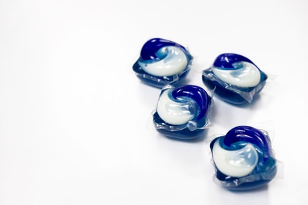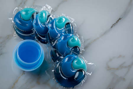 Laundry capsules close-up and copy space. Washing powder, gel for washing.