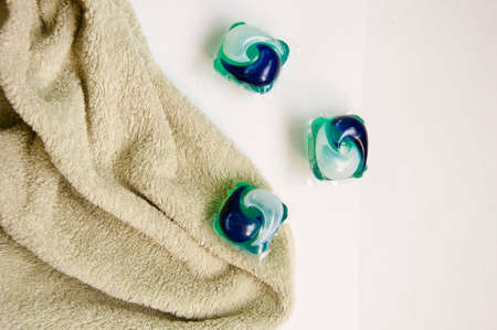 detergent pods and towel isolated on white. minimalism of detergent. laundry detergent.