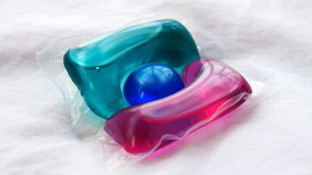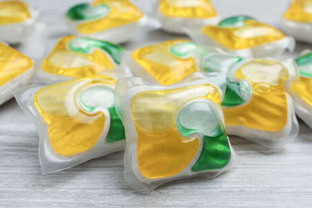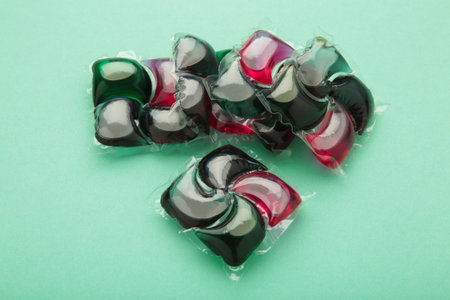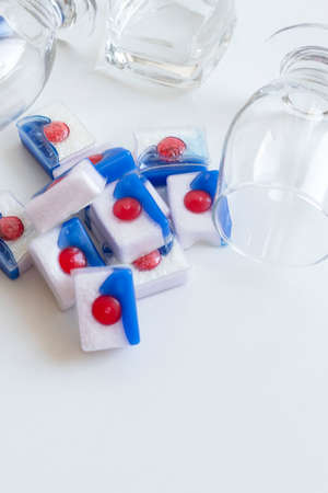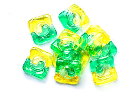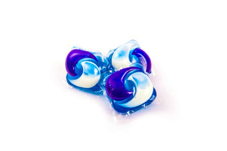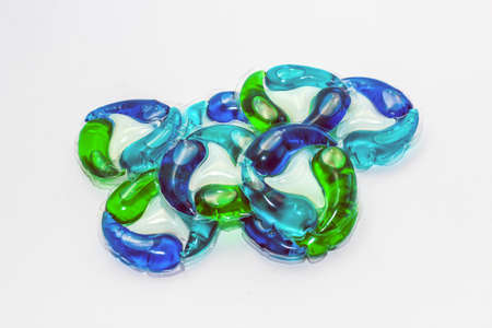 washing pods on white background, close up, abstract color background.liquid detergent,capsules with colored gel.3 in 1 laundry detergent pod. Economic and environment friendly for clothes washing
