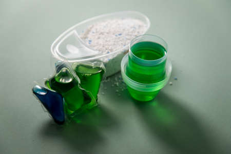 Blue laundry detergent sorts variety in powder, liquid gel and pod in washing dose.Liquid pods with gel and softener in blue and green.Laundry capsules.Copy space