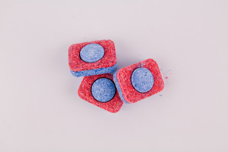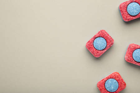 Red and blue tablets for dishwashing machine. Detergents for home hygiene. Dishwasher capsules on gray background. top view