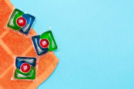 Laundry capsules lie on an orange towel. Place for text. Copy space. Top view. Flat lay. Blue background. Washing concept.
