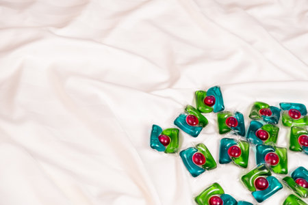 Lots of laundry pods capsule detergent on satin fabric, copy space for text.