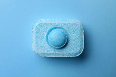 Red and blue tablets for dishwashing machine. Detergents for home hygiene. Dishwasher capsules on blue background. top view