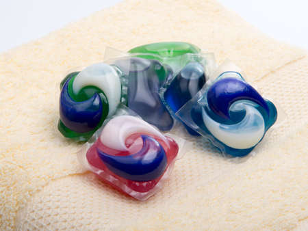 Washing gel capsule pods with laundry detergent on a pile of white cloth background.