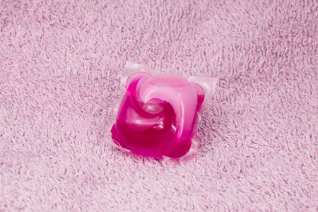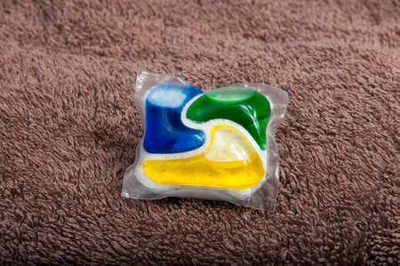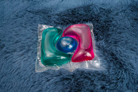 closeup of laundry detergent gel pods. fabric softener in washing capsule.