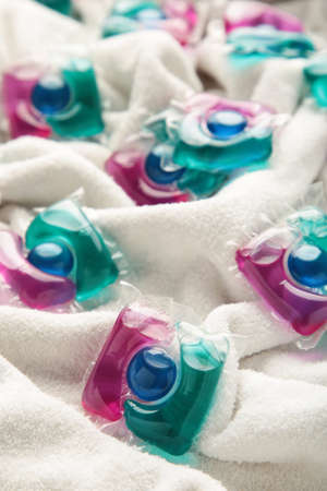 Washing gel capsule pods with laundry detergent on a pile of white cloth background