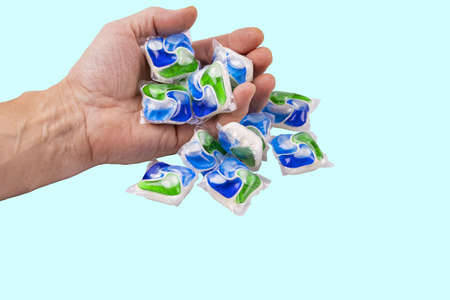 Close up view of colorful dishwasher capsules in male hand on blue background.