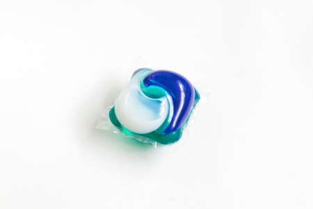 Washing gel capsule pod with laundry detergent isolated on white background.