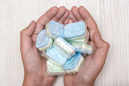 Hands holding many green and blue dishwasher soap tablets in water-soluble packaging