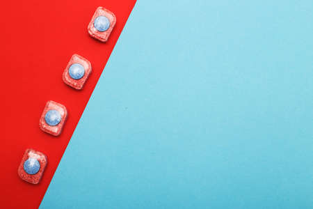 capsules for kitchen dishwashers on a blue and red background. flat lay
