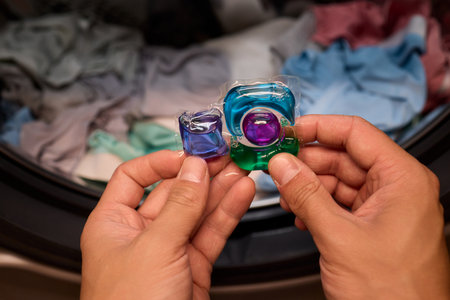 Laundry pod placement, Load blue detergent capsules into machine for hygienic washing, Preparing laundry by placing capsules carefully into washing machine for cleanliness