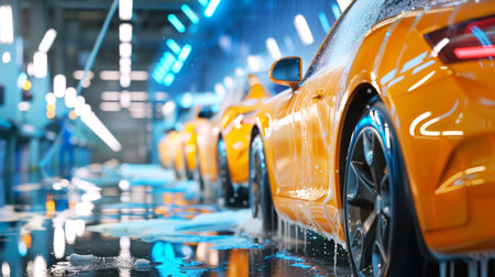A luxury car covered in soap and water during a wash, showing its sleek design and shining headlights. High quality photo