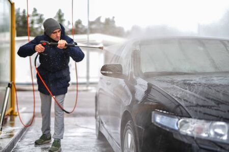 Young man washing his car in car wash. Cleaning Car Using High Pressure Water. Washing with soap.