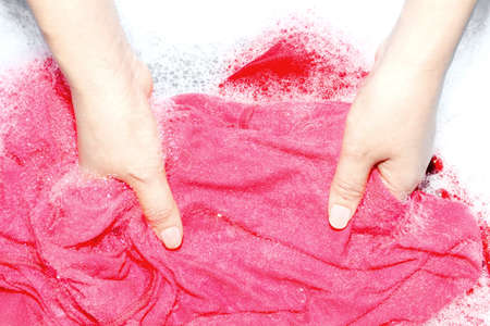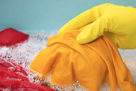 Wash color clothes with hand and soak cloth in laundry detergent water in tub washing.