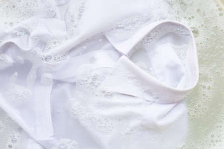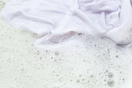 Top view of clothes soak in powder detergent water dissolution. Laundry concept