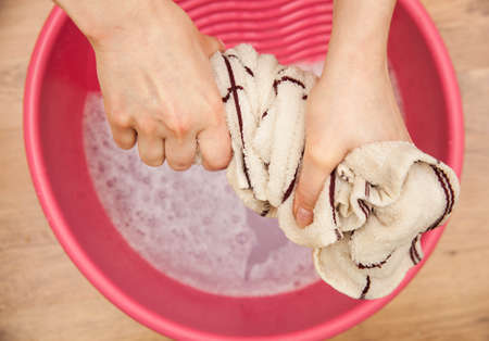 Girl is washing things with her hands, washing in a basin, washing her things, cleaning at home, washing a white blouse