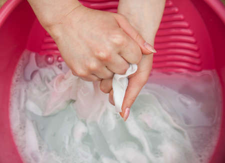 A woman washes clothes with her hands in soapy water. Hand wash clothes.