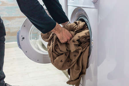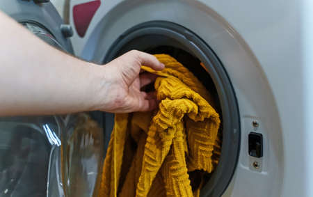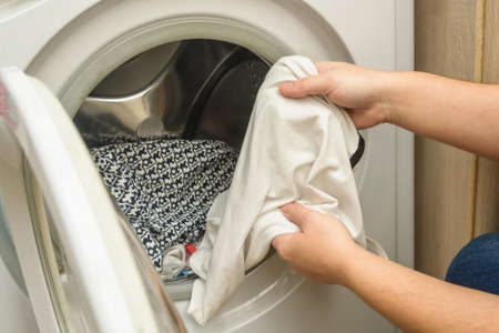 Caucasian woman puts clothes in the washing machine close-up. selective focus.
