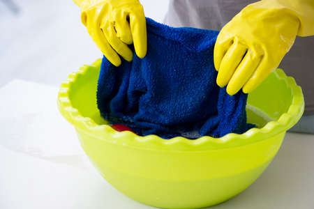Female hands in rubber gloves washing clothes in basin on a blue background, top view.