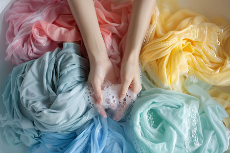 High quality photo of female hands diligently washing vibrantly colored clothes in a basin