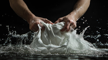 A dramatic view of water splashing as hands twist a drenched cloth, set against a dark background