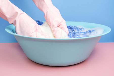 Female hands in rubber gloves washing clothes in basin on blue and pink background.