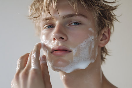 Close-up of a teenager enjoying their morning routine by washing their face with foaming cleanser, resulting in playful bubbles and a refreshed expression.