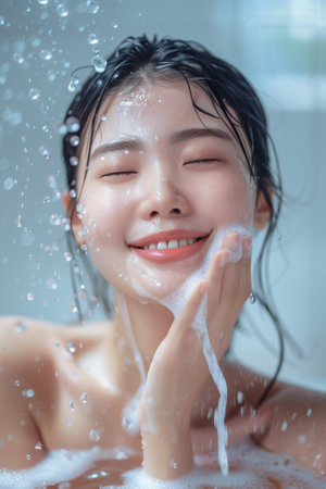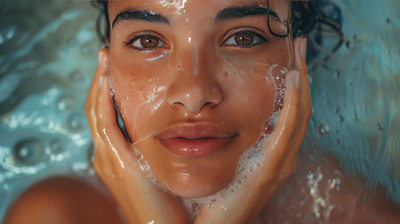 A woman bathing and washing her face with water, air bubbles floating around. The concept of cleanliness and relaxation. Copy space available.