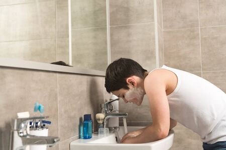 Young man with beard and mustache washing his face with cleansing foam and water. Facial skincare.