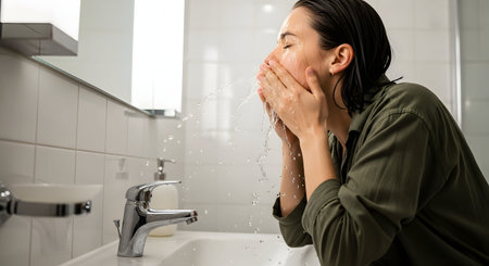 A young woman washes her face with water at a bathroom sink, creating a refreshing splash against her skin. The image captures a daily skincare and hygiene routine in a clean, modern bathroom environment.