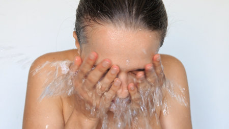 Beauty influencer, washing face, touching her face with her hands with soap foam