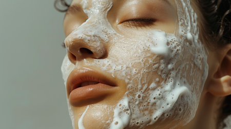 Close up of a young woman applying cleansing foam on her face, highlighting the concept of skincare and beauty routine