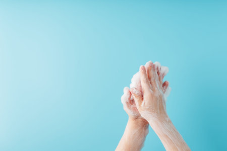Senior woman washing her hands in white background, Close up & Macro shot, Selective focus, Prevention from covid19, Bacteria, Healthcare concept
