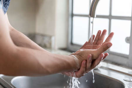 Man use soap and washing hands under the water tap. Hygiene concept hand detail.