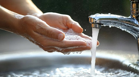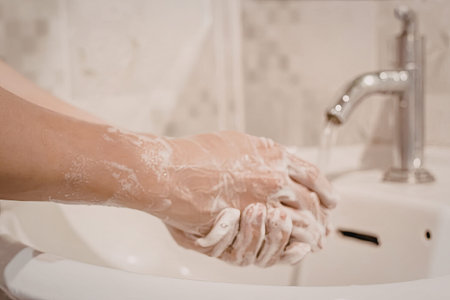 Closeup view of a woman thoroughly washing her hands with clean tap water in home bathroom.