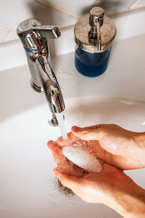 Cleaning hands with soap and water during coronavirus pandemic. Social distancing and other preventive methods