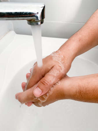 Man washing his hands with soap. Coronavirus transmitted through a hands.