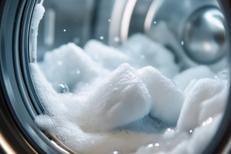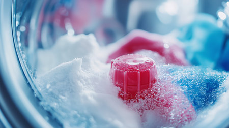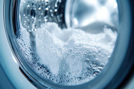 Vibrant laundry detergent bubbles mixing with clothes in a washing machine during a bright morning wash cycle