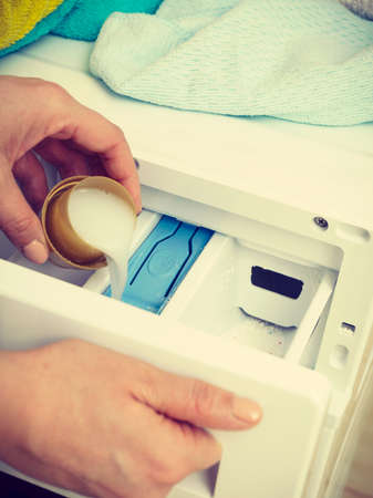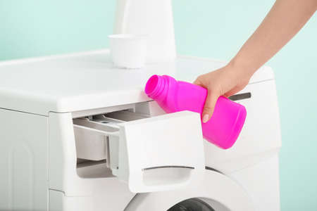 Householder woman using conditioner for washing machine