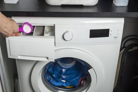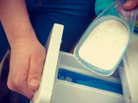 Washing powder detergent and measuring cup pouring into machine. Household duties, clothes laundry obejcts concept.