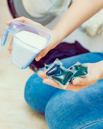 Woman in bathroom doing laundry, choosing the best detergent. Female holding powder container and gel pods for washing clothes. Household duties.