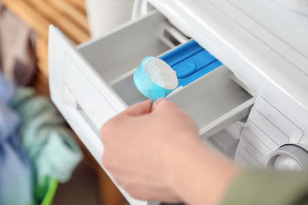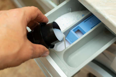 A man pouring laundry detergent or washing powder into the washing machine.