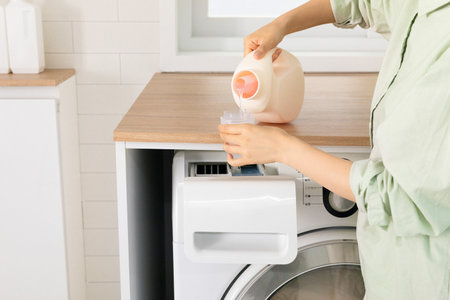 Close up of female hands pouring liquid laundry detergent into cap in the washing machine. Pour green washing liquid, wash machine blurred in background.