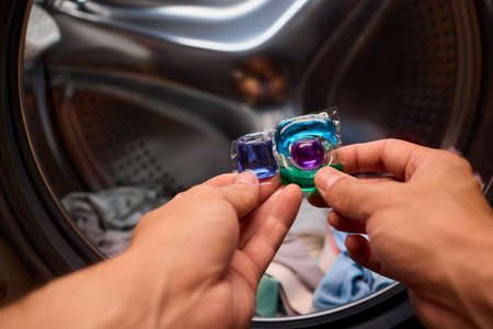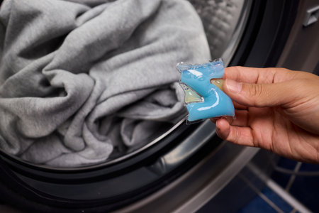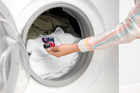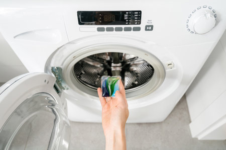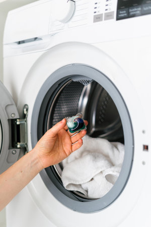 Woman hand holding laundry pod and placing liquid detergent gel in capsules a into a modern washing machine in bathroom. Washer ready for efficient cleaning of household items like towels and clothing