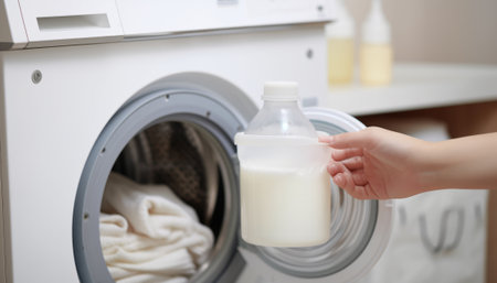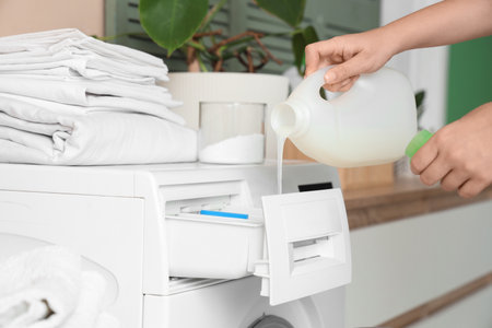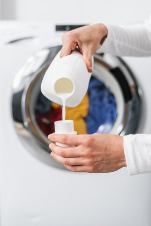 Closeup of a womans hand pouring white liquid fabric softener to the washing machine