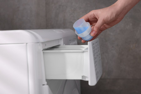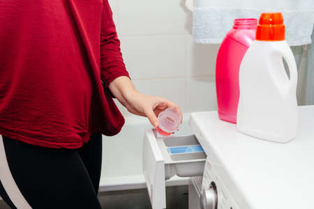 Woman Pouring Detergent or Liquid Fabric Conditioner Into Washing Machine, Close Up view