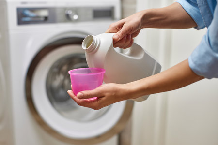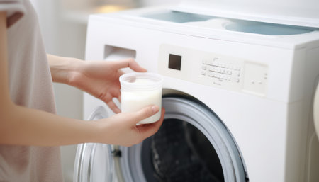 Woman's hand adding fabric softener to washing machine.