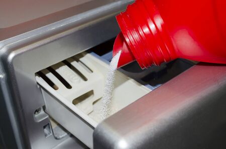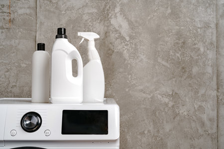 Washing liquid detergents on washing machine in a laundry room